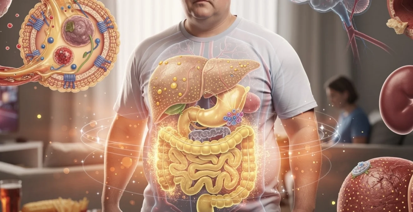Sans prise en charge, le syndrome métabolique évolue fréquemment vers des pathologies chroniques plus sévères, au premier rang desquelles le diabète de type 2 et la stéatose hépatique non alcoolique, qui peut progresser vers une forme inflammatoire appelée NASH (non alcoholic steatohepatitis). Ces deux complications partagent des mécanismes communs : insulinorésistance, surcharge lipidique hépatique, inflammation chronique et stress oxydatif. Elles contribuent à leur tour à aggraver le risque cardiovasculaire et à altérer la fonction d’autres organes comme le rein ou le système reproducteur.